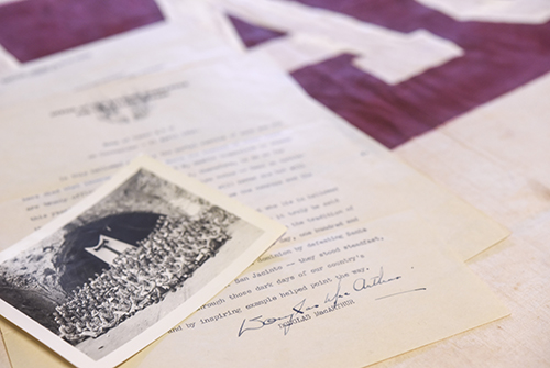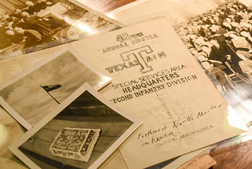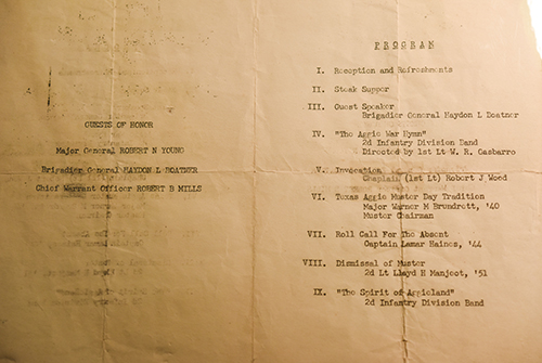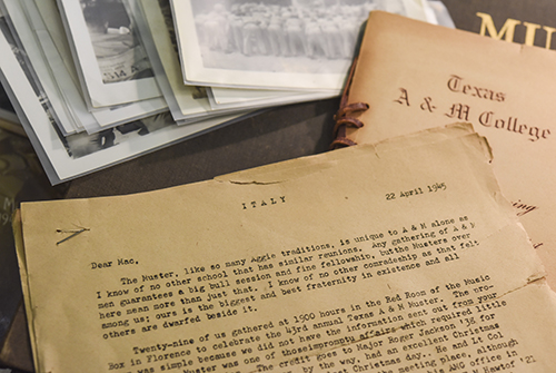 The university’s collection includes the Corregidor Aggie flag from the 1946 Muster, black and white photographs from World War II-era Muster ceremonies; newspaper clippings; a letter dated 1945 detailing the 43rd Muster ceremony held in Florence, Italy; the program from the 1946 Campus Muster; and the program from a Muster held in North Korea in 1952.