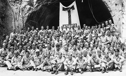 When World War II ended in 1945, the Filipinos were liberated from Japanese occupation. Over 100 Aggie soldiers returned once more to the island of Corregidor the following spring in 1946 to stand at the mouth of Malinta Tunnel and call the Muster for lives lost during the war. They used a table cloth as an improvised Aggie flag and hung it over the tunnel as they stood at attention singing “The Spirit of Aggieland.”