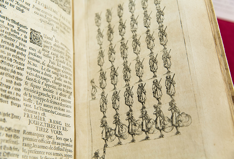 Visiting military historians and scholars, as well as history classes, visit Cushing Library to view this collection, as it offers a glimpse into life during these troubled times. A chronological study of these materials takes researchers on a journey through military and technological advancements, as armies shifted from using weapons such as pikes and swords to flame-throwers in the 1940s.