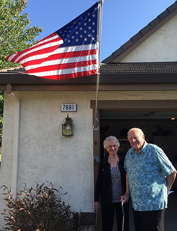 An American flag flies proudly outside the home of Dorthy and Jim Staehs ’55 in San Jose, California, calling attention to a plaque below that bears Jim’s patriotic quote.