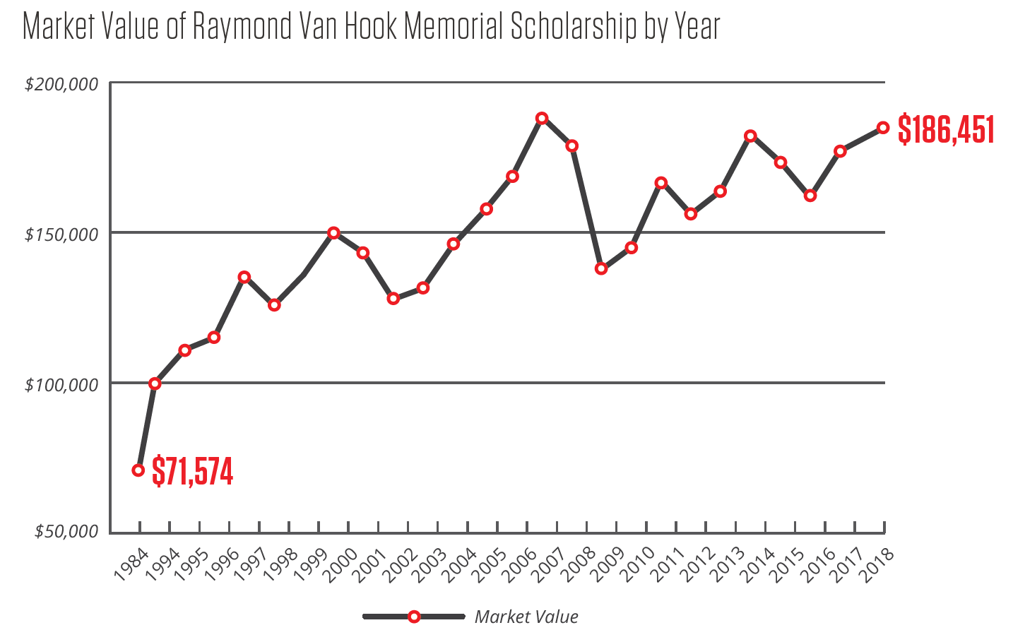 The graph shown here illustrates the power of an endowed fund created through a planned gift by the late Minnie Van Hook to honor her late husband, Raymond Van Hook (Class of 1921), an electrical engineering graduate. After her passing in 1984, the Foundation received $71,574 from her estate to create the Raymond Van Hook Memorial Scholarship. Today, the endowment has a market value of $186,451 and currently provides scholarships to eight Aggie electrical engineering students. Since its creation, the total payout that has benefitted students from this endowment amounts to more than $173,200*.