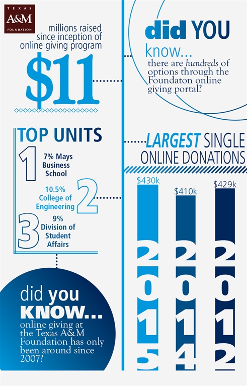 4. An online gift is just the start. Don’t get stuck in the mindset that online gifts are only for a small or one-time donation. Here are a few statistics that show just how profitable online giving has been seen its inception. In fewer than 10 years, online giving has made great things possible at Texas A&M. As the digital age continues to grow and expand, the possibilities for online giving are endless.