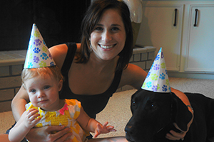 Stacey Cook, with daughter Grace celebrate a birthday with their black Labrador retriever, Callie.