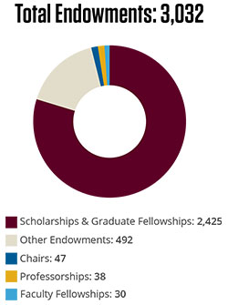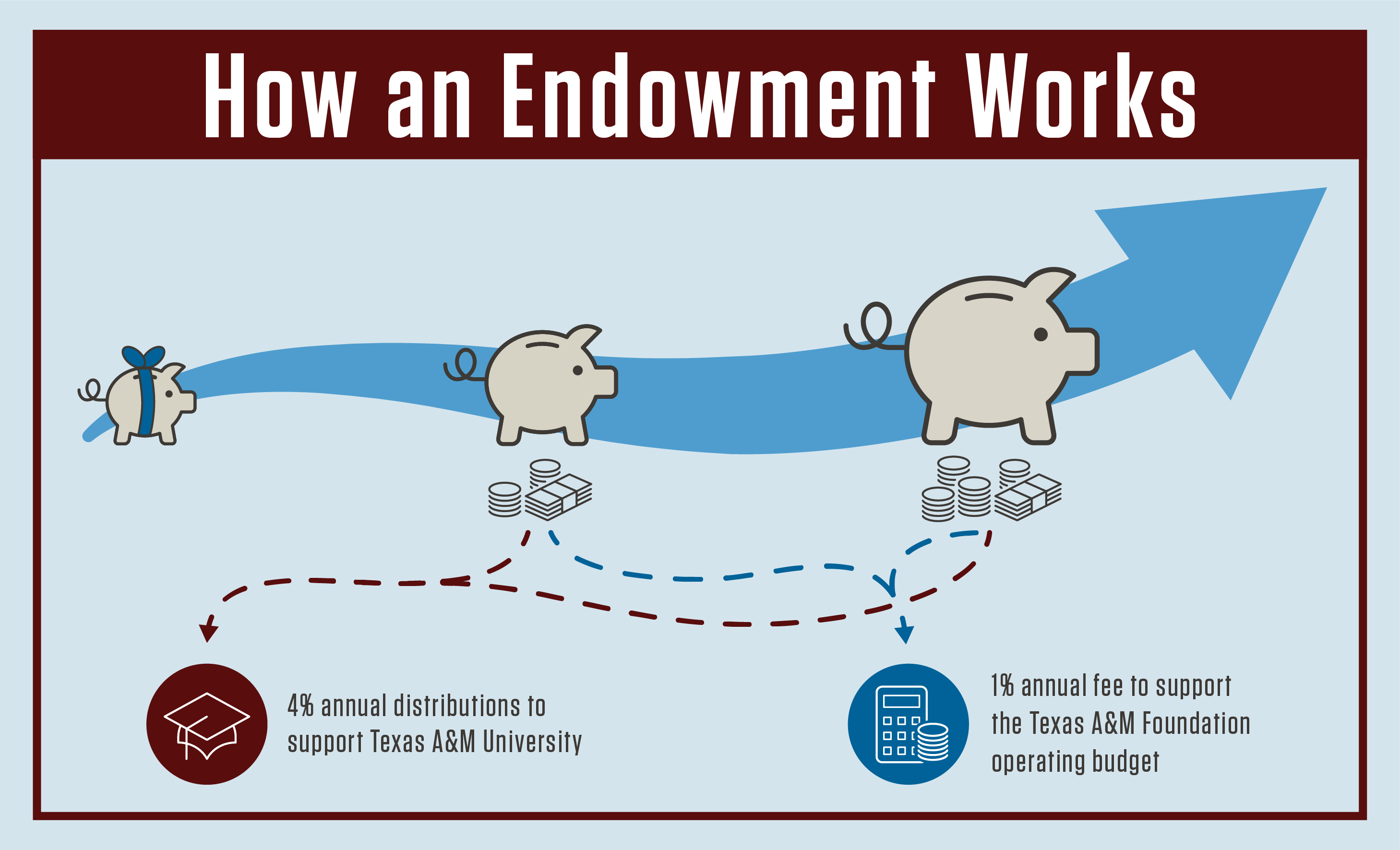 An “investment” is exactly what an endowment is. When you create an endowment in the form of a planned gift to the Texas A&M Foundation, you are making a commitment of a specific dollar value (current minimum expectancy  $25,000) to direct your gift to support your passions in Aggieland. After your lifetime, your gift, known as the “principal,” is invested by the Foundation’s highly skilled investment team. Each year, payout from a percentage of the principal is released. This percentage is determined by long-term goals and current market conditions and is based on a rolling five-year average of the collective endowment the Foundation manages for the university's benefit. The annual payout will support your designation, whether it be scholarships, fellowships, student activities, campus facilities or beyond. The most significant part of this process is that the investment principal is preserved, and a perpetual flow of spendable funds will support an area you designate, creating a lasting impact on Aggieland.