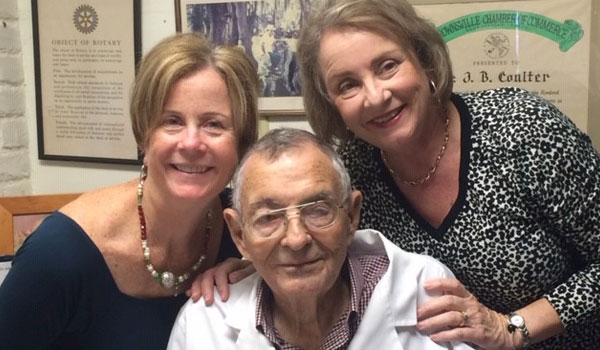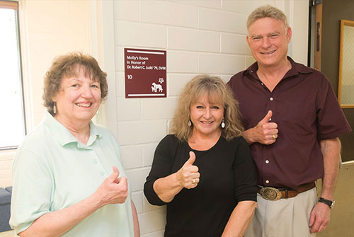 Janel Griffey (left) stands with her devoted Aggie veterinarian, Dr. Robert Judd '79, and his wife, Deborah, in front of the comfort room she donated in his honor.