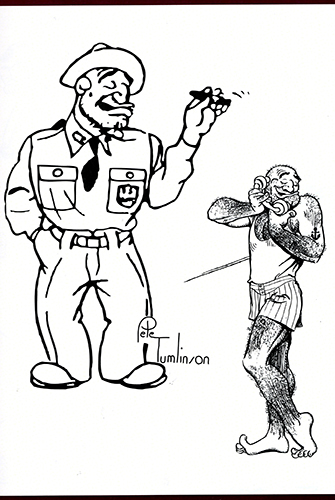 During Tumlinson’s tenure at the Battalion from 1938 to 1942, he advanced to editor and introduced other popular characters, beginning with “Battalion Betty,” who was frequently featured on the covers of the Batt magazines. He later created “The Tumlinson Boy,” a satirical male pinup character, and “Fish Blotto,” a sidekick to Ol’ Sarge. Pete designed the characters to complement each other, allowing his sense of humor to show through the expressions and gestures of his creations.