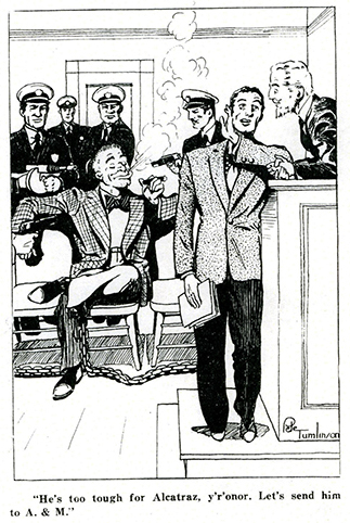 A 1938 illustration in the monthly Battalion Humor Magazine depicts a strong-jawed prisoner casually smoking as prison guards and a lawyer discuss his fate with a judge. It reads, “He’s too tough for Alcatraz, y’r’onor. Let’s send him to A & M.”
