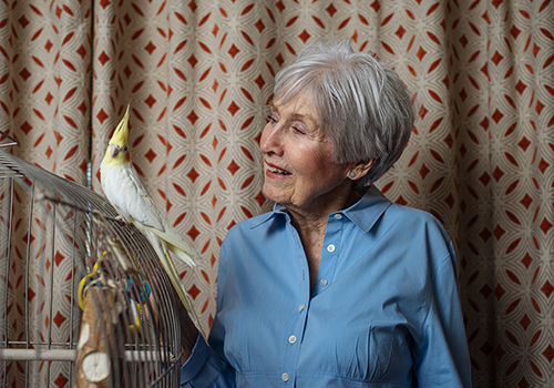 Like most cockatiels, Sonny loves to whistle and enjoys spending time with Cherilyn and her two dogs. “Every night, if I’m watching TV, I open the cage, and he comes out,” she said. “He flies around and sits on my head and talks to me. He loves the dogs and talks to them in his own special language, and they love him.”