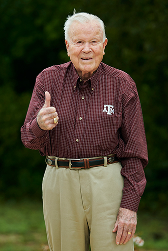 The East Texan was among the first generation in his family to attend college and holds the honor of being the family’s first Aggie. At the time, Aggieland was a different place. The railroad tracks marked the edge of campus, and all students were members of the Corps of Cadets. The freshman class totaled 1,500 and students didn’t eat meals off campus. Hitchhiking was the norm; at the end of each semester, hundreds of students lined up along the highway to catch rides home.