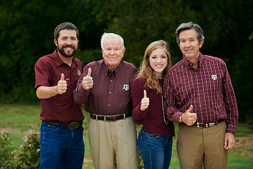 Bill Lonquist's loyalty to Texas A&M influenced his family, which now boasts three generations of Aggies. Shown from left to right is Kyle Lonquist '13, Bill Lonquist '48, Katie Lonquist Thomas '17 and Paul Lonquist '77.