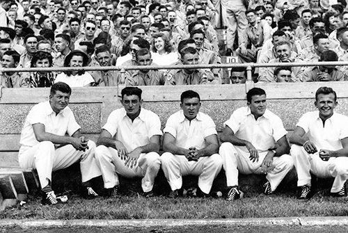 Bill Lonquist '48 (second from right) served as a Yell Leader with (left to right) Jim Stephens ’49, Dr. James H. “Red” Duke ’50, Tommy Splittgerber ’49 and Glenn Kothmann ’50.