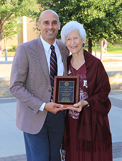 JoAnn with Tyson Voelkel '96, president of the Texas A&M Foundation. As a reflection of their love and appreciation for their mother’s lifetime devotion to her Aggie family, the Ledlow children established an Endowed Opportunity Award (EOA) in her honor to support middle-income students who often miss out on other need-based funding but still require significant support to attend Texas A&M.