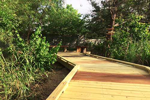The boardwalk, built as part of a research project during the spring 2017 semester, serves as a shaded area with a view of the rain gardens. The project allowed students to find out how weather affects the materials used on the boardwalk.