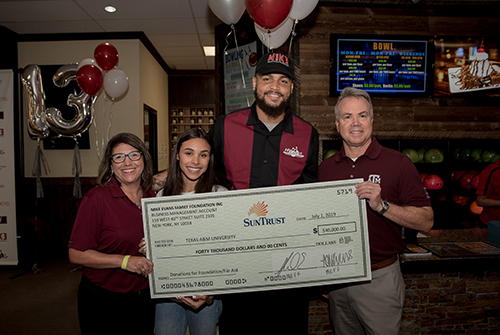 During the bowling event, Mike and Ashli presented a $40,000 check from their Mike Evans Family Foundation to Texas A&M. Half of their gift established $2,000 scholarships for 10 students through the Scholarships and Financial Aid office, while the other half established two $10,000 Foundation Excellence Award (FEA) scholarships through the Texas A&M Foundation. All of the scholarships are designated for students from Galveston who demonstrate financial need, while FEA scholarships specifically help recruit and retain outstanding undergraduates from historically disadvantaged groups.