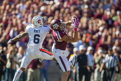 Mike Evans '15 played wide receiver for the Aggies for two seasons before declaring for the NFL draft after his sophomore year. He was the seventh overall pick and was chosen by the Tampa Bay Buccaneers, where he has played for five seasons.