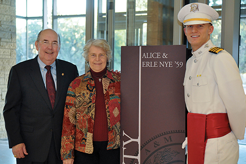 In recognition of Texas A&M’s role in his life, the Dallas-based Nyes began to give back to the university financially and with their time. Erle has served on a host of boards and committees, including the 12th Man Foundation Champions Council, the College of Engineering’s Advisory Council and the Corps of Cadets Development Committee. For 12 years, he also served as a regent for the university system. The couple has funded scholarships and contributed to building funds, such as the renovation of the Memorial Student Center.