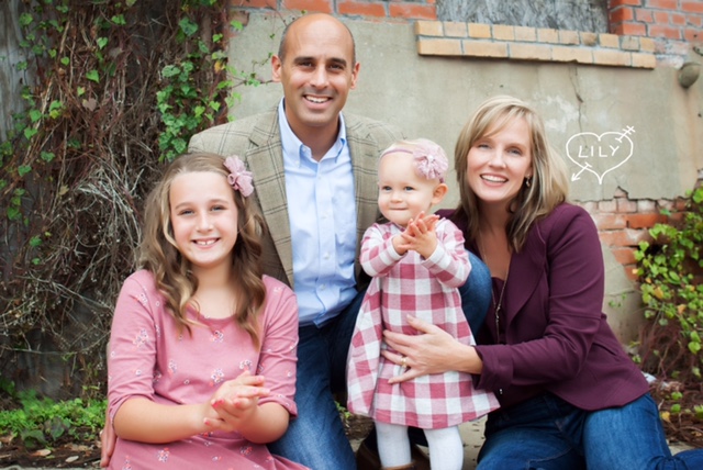 Tyson Voelkel, the newly appointed president of the Texas A&M Foundation, poses for a photo with his wife, Christi, and their daughters, Eliana, 9, and Violet, 17 months.