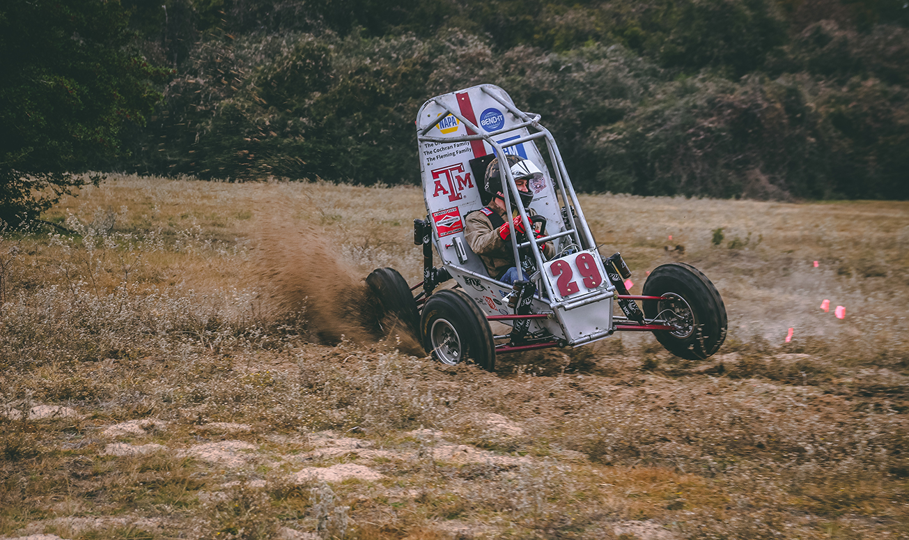 Texas A&M University’s BAJA SAE race team is an interdisciplinary engineering design team determined to develop world-class engineers. Each year, its members are tasked with creating a single-seat, off-road vehicle, such as the one pictured and driven by Christopher Larson ’21, to compete against hundreds of schools across the globe. The team spends countless hours researching, building and prototyping to produce a champion race car.